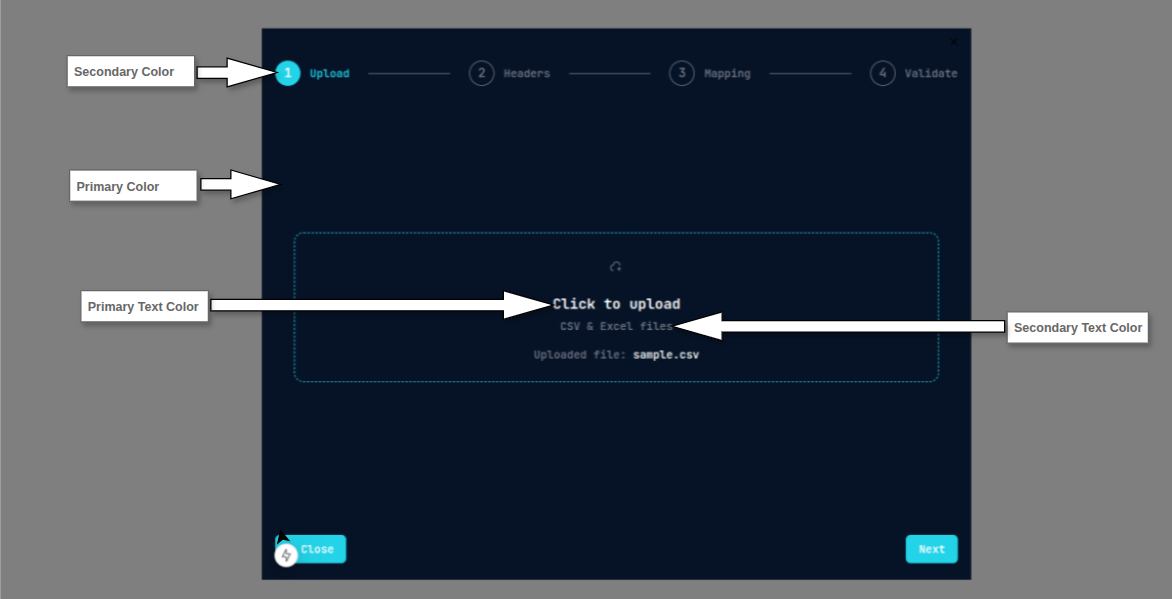 To help you understand how each color applies within the modal, the following illustration highlights each color zone.