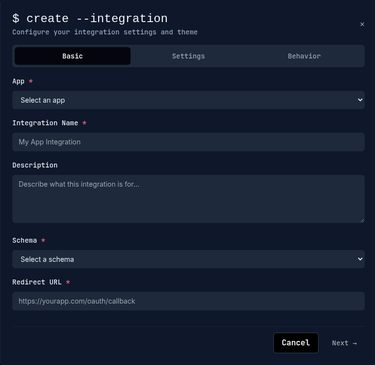 You’ll be guided through three configuration steps: Basic, Settings, and Behavior.