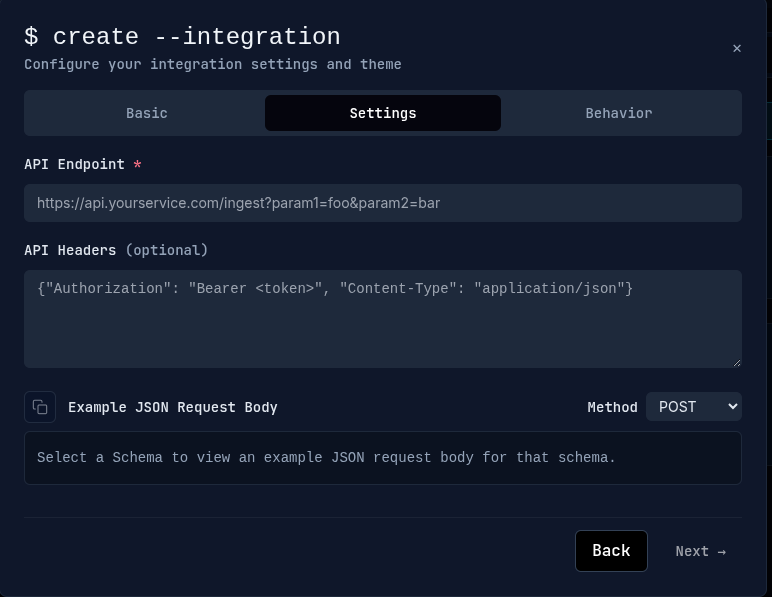 Example:https://api.yourservice.com/ingest?param1=foo¶m2=barAPI Headers — (optional) Add authentication and content-type headers that your endpoint requires. If your headers include dynamic values (for example per-user Authorization tokens), prefer leaving them out of the static integration and supply them at launch time using the Launch API